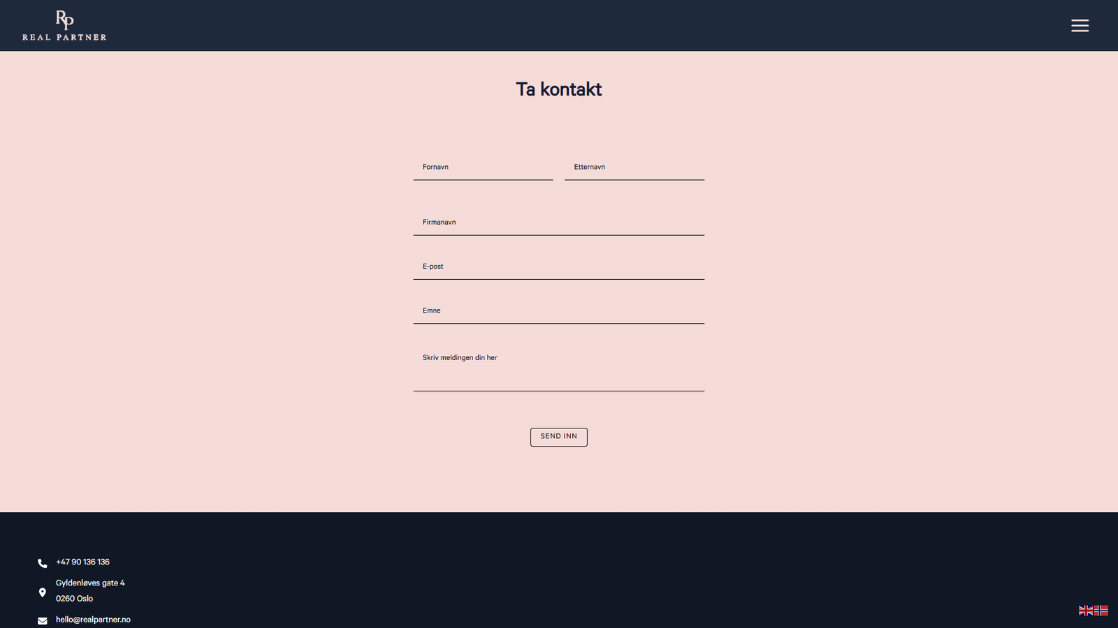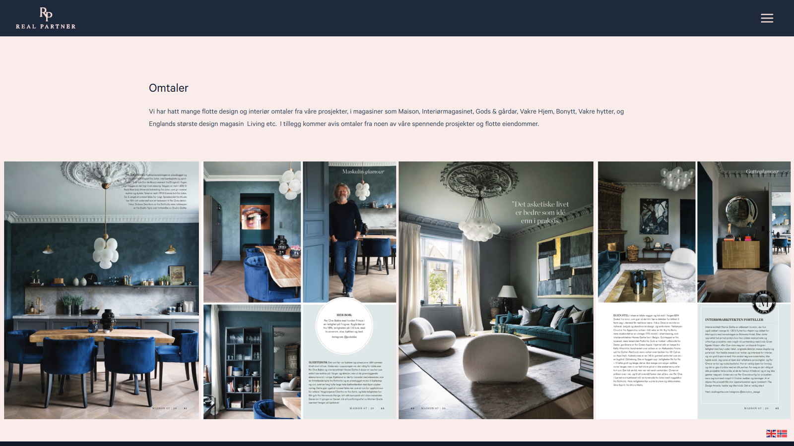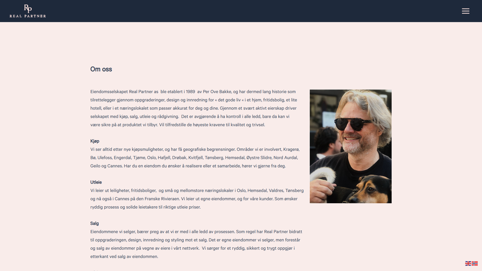 Eiendomsside for Real Partner med tydelig oversikt over kjøp, salg og utleie, og automatisert annonsering via Finn API.
