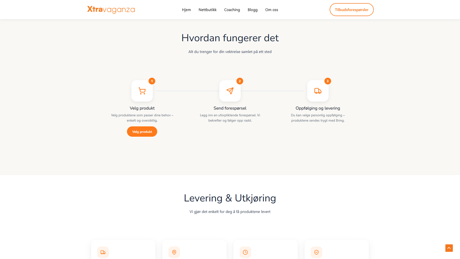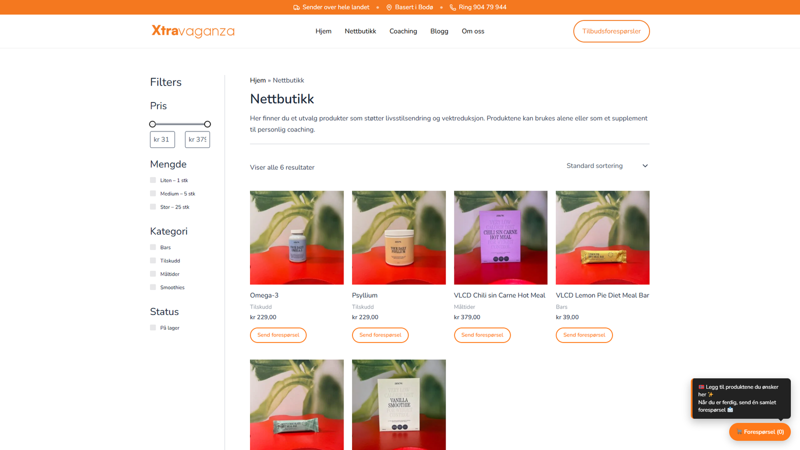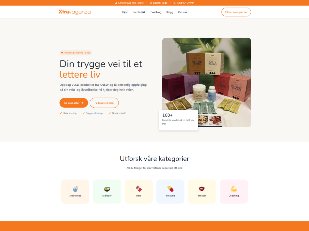 Xtravaganza er en nettbutikk kombinert med personlig coaching, laget for å gjøre det enkelt å utforske produkter, sende inn forespørsel og få oppfølging. Vi bygget en ryddig nettbutikk med tydelige kategorier, filtrering og en forespørselsflyt som lar kunden samle produkter og sende én samlet henvendelse. I tillegg satte vi opp egne landingssider for coaching og innhold som forklarer hvordan prosessen fungerer, levering og kontakt.